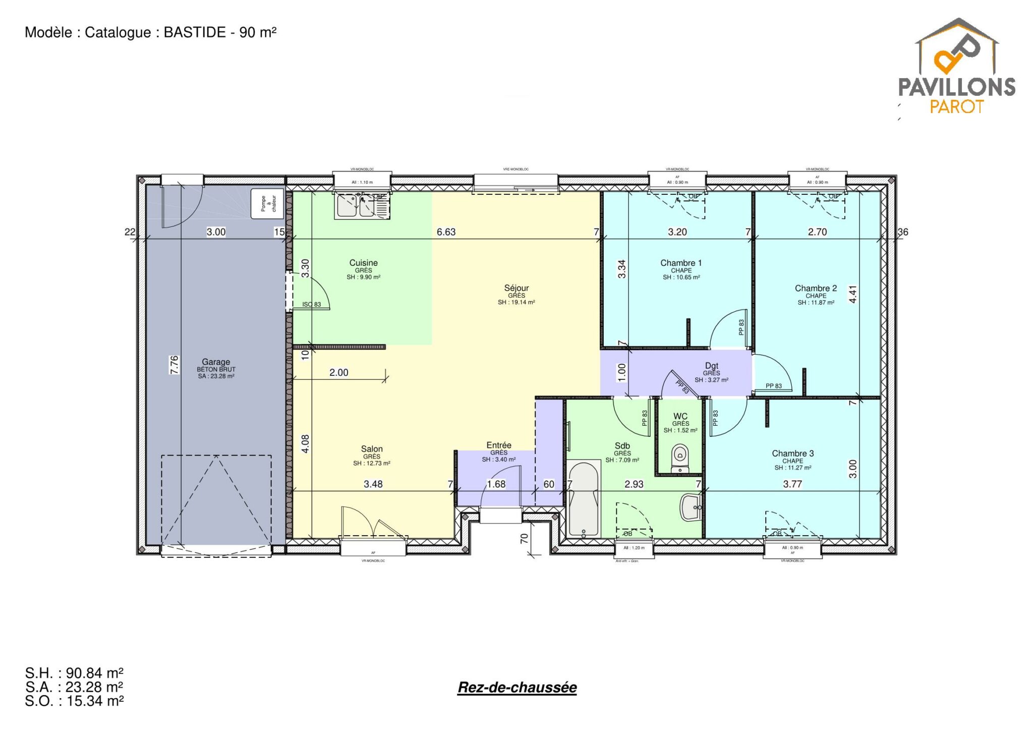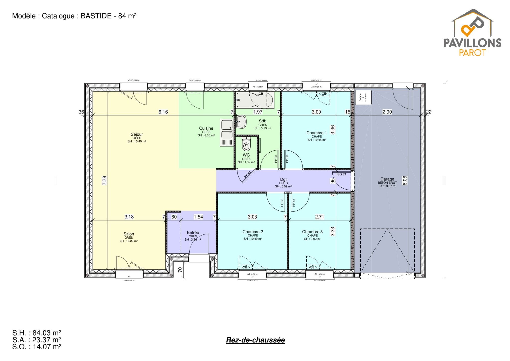 Le plan de la Bastide est intelligemment étudié pour optimiser l’utilisation de l’espace. Elle offre une pièce de vie agréable, de dimension généreuse. Séparée, la partie nuit avec dégagement comprend chambres, salle de bains et wc indépendants. Elle comporte un garage intégré communicant avec la cuisine.