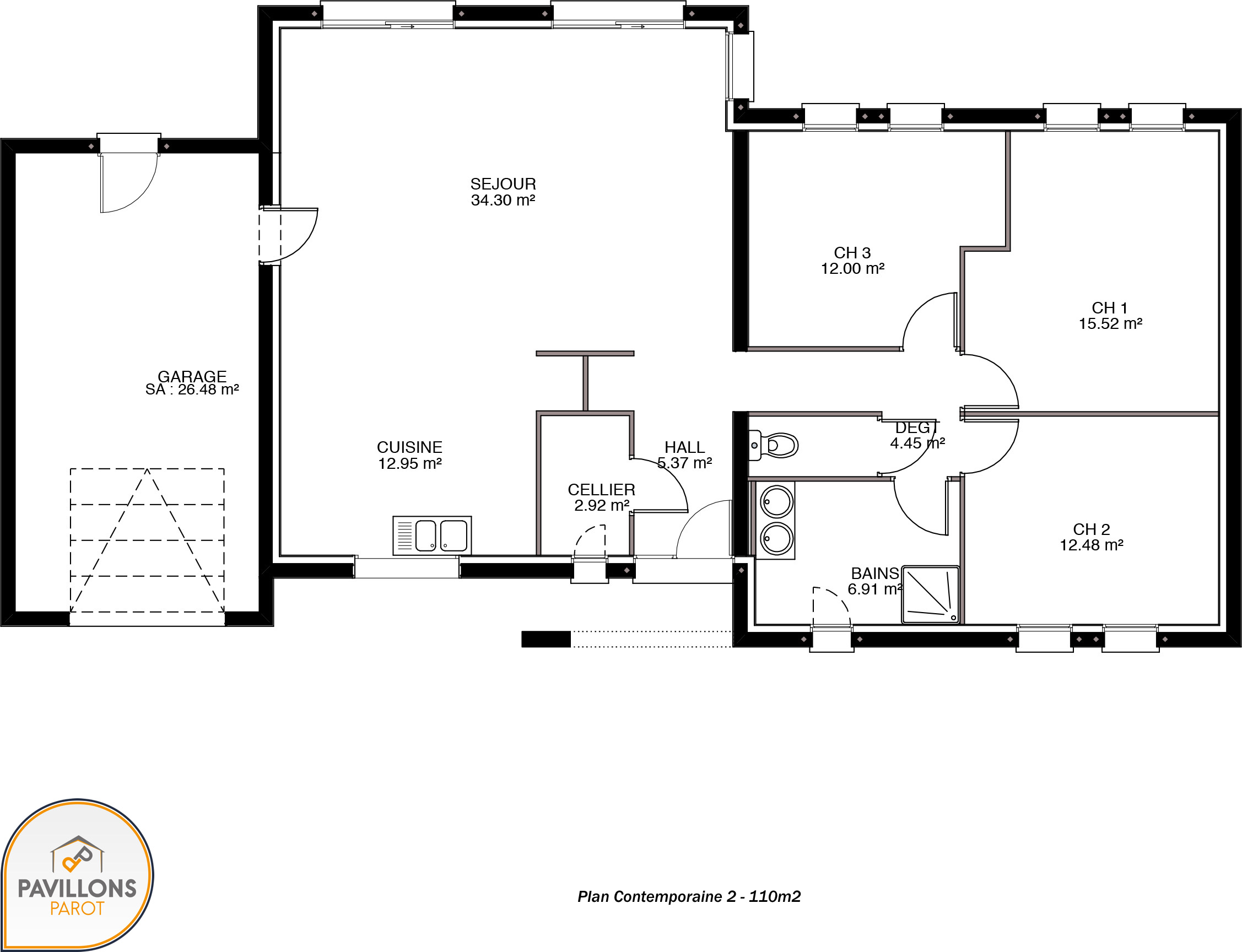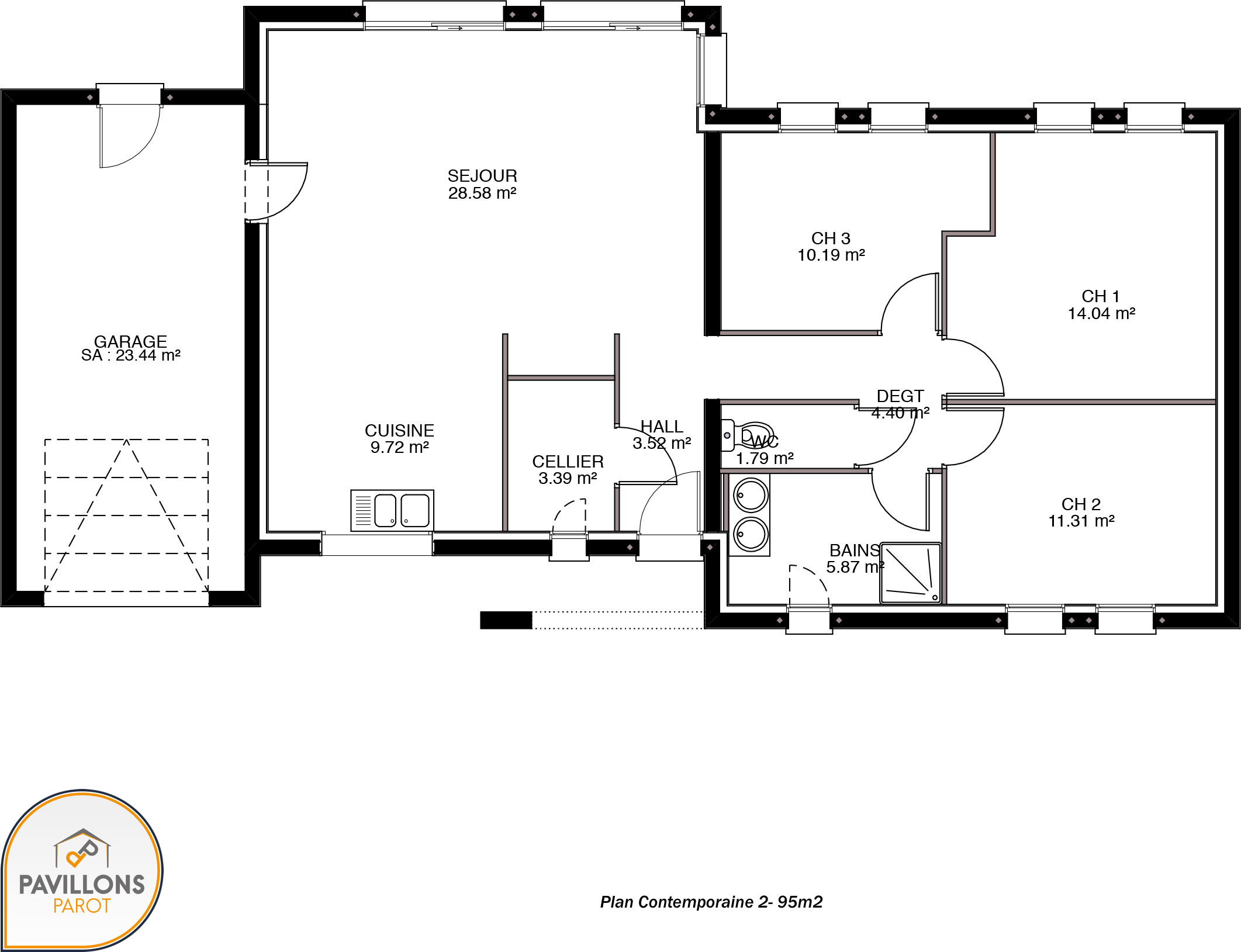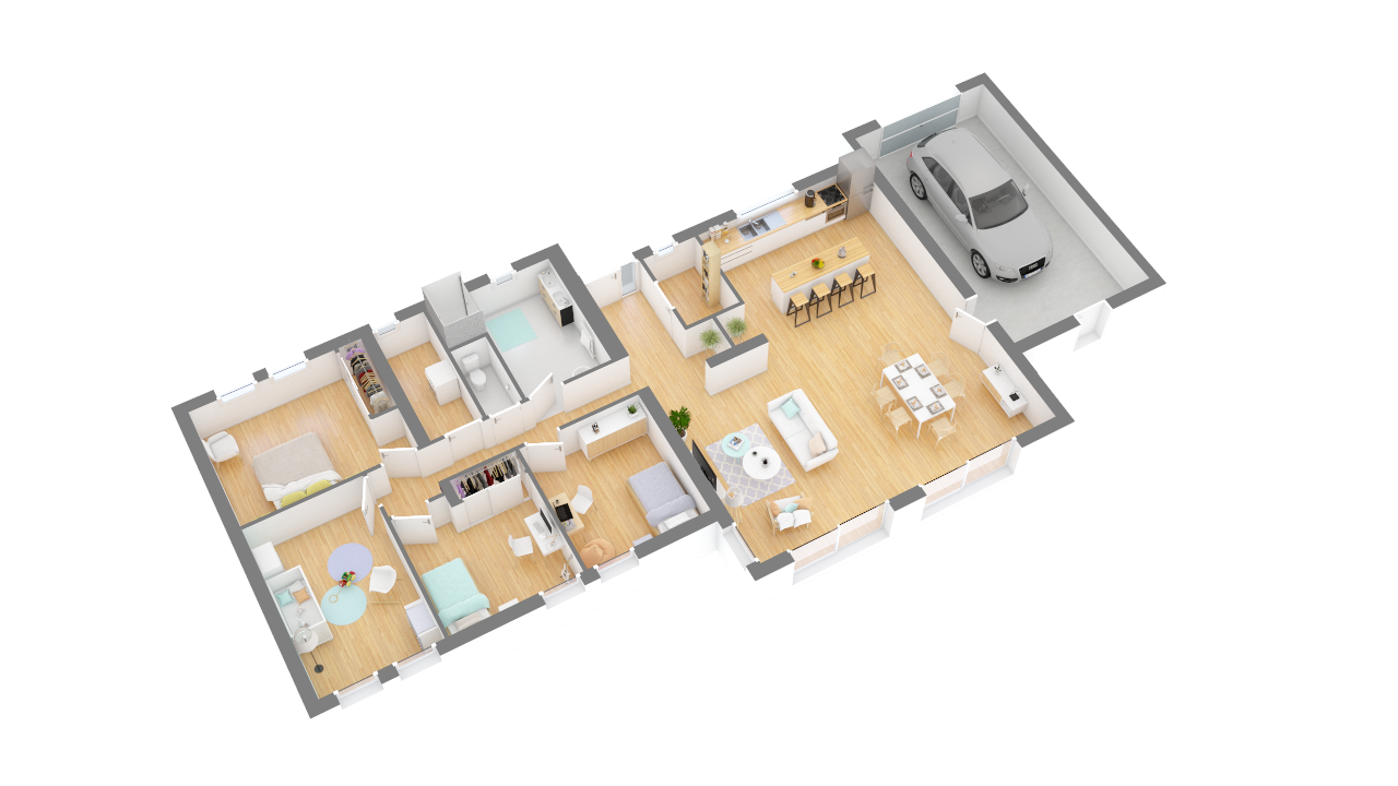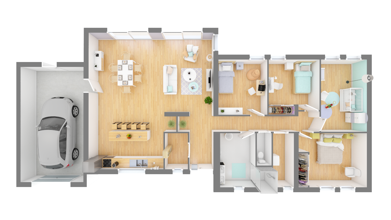 Disponible dans des surfaces allant de 85 m² à 125 m², elle propose 3 ou 4 chambres selon sa configuration. Ce modèle est doté d’un garage intégré.