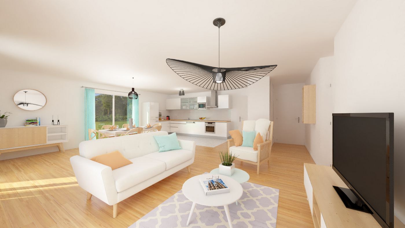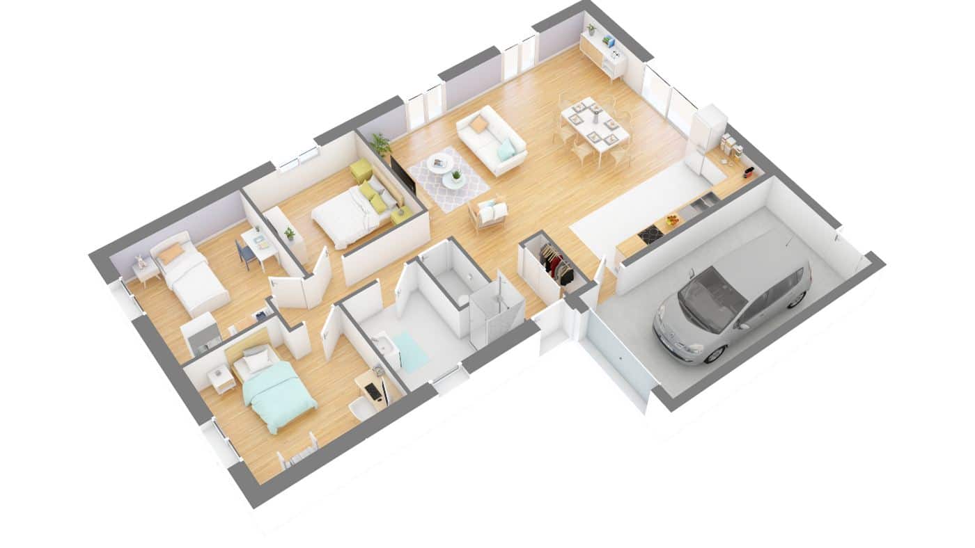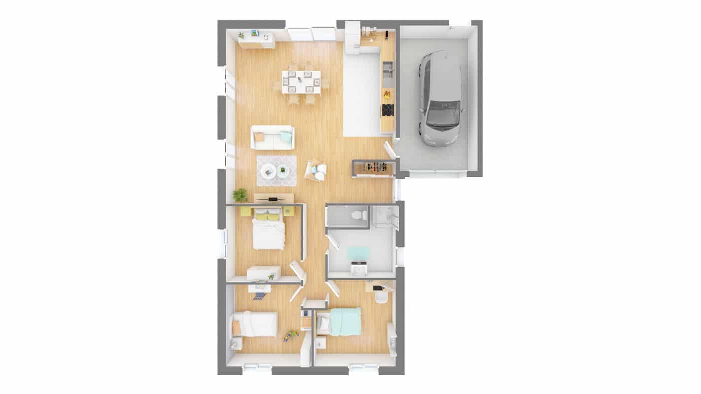 Maison coup de cœur, c’est un très joli caprice à satisfaire. Cette sympathique demeure est idéale pour les terrains étroits. Elle offre un vaste séjour lumineux avec cuisine ouverte. Et des chambres confortables, au nombre de 3 ou 4 selon votre choix, donnant sur un dégagement. Le placard à l’entrée fait office de séparation. Cette maison conforme à la RT2020 est équipée d’un chauffage au sol. Ce qui vous assurera une chaleur douce et agréable.