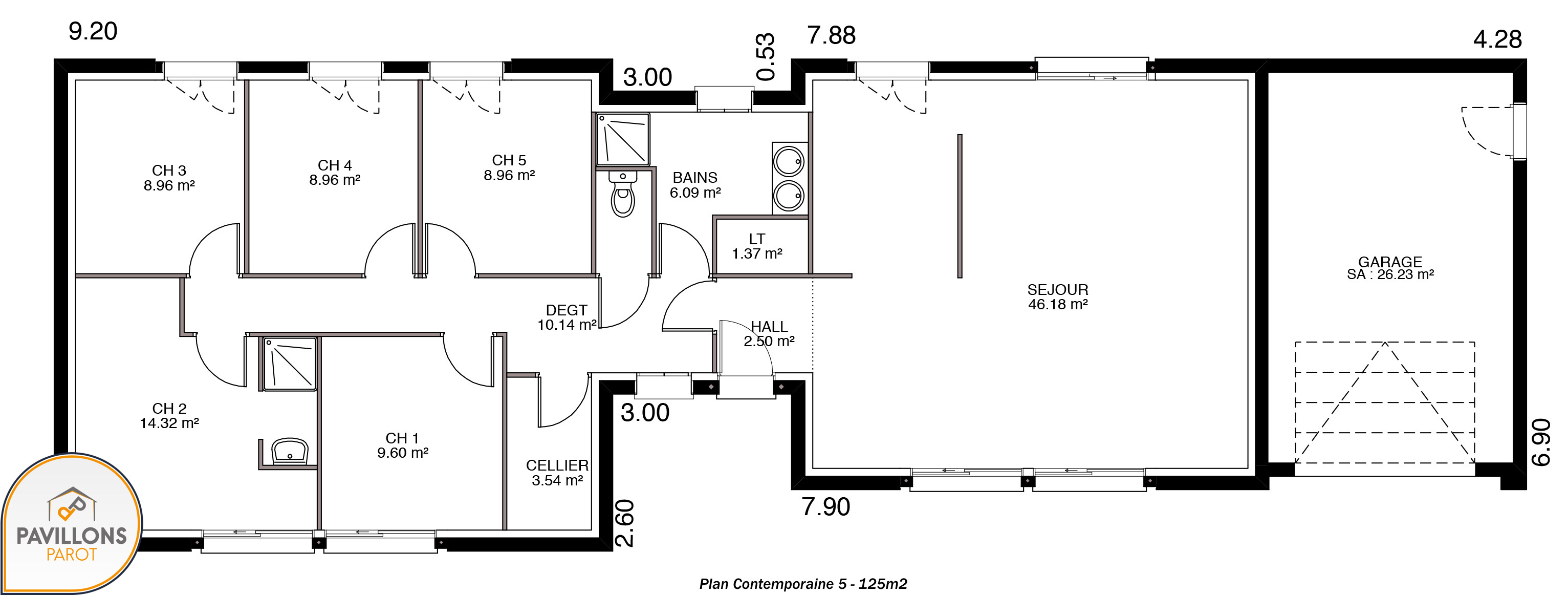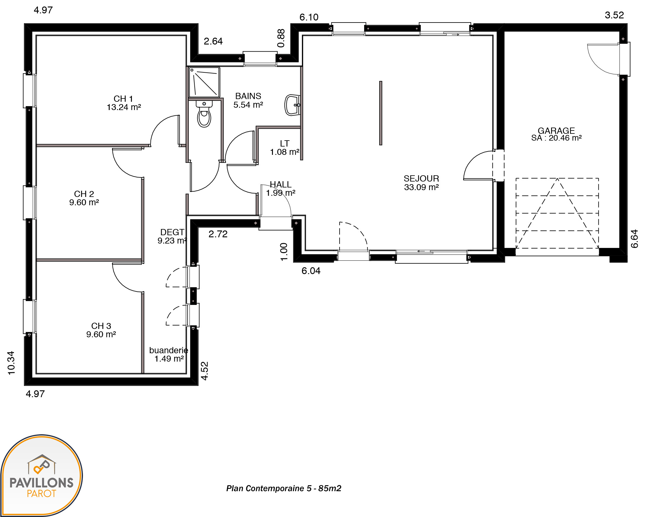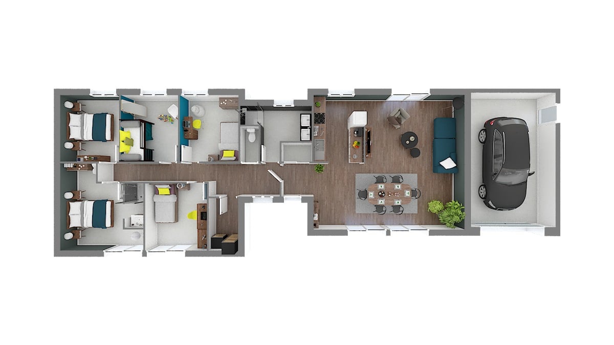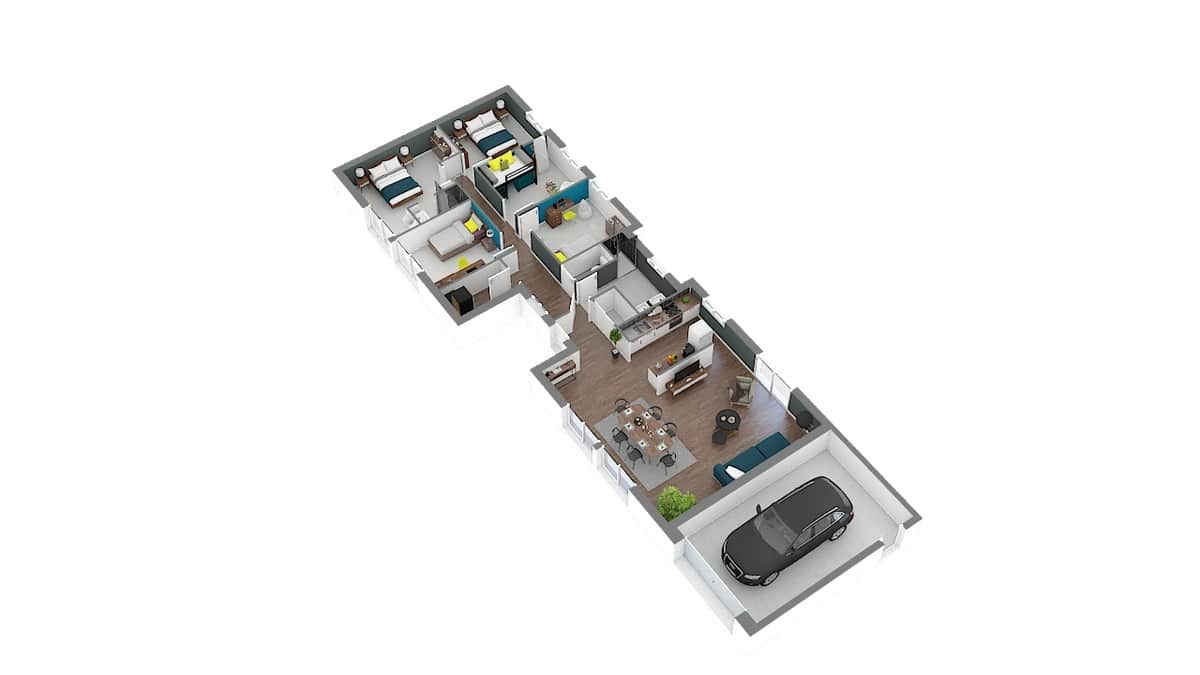 Attention, coup de cœur ! Vous rêvez d’une maison comme on en voit au cinéma ? C’est l’Eole qu’il vous faut ! Superbe demeure contemporaine design, cette maison d’architecte est d’une beauté renversante. Ses dimensions, de 85 m² à 125 m² selon vos besoins, vous offre de beaux volumes. Son plan en L vous permet de disposer d’un aménagement intéressant. En effet, l’espace nuit est parfaitement délimité grâce à sa forme et séparé de l’espace jour par deux dégagements, le premier accueillant l’entrée. Vous pourrez disposer, selon les variantes, de 3 à 4 chambres, dont une suite parentale en option.