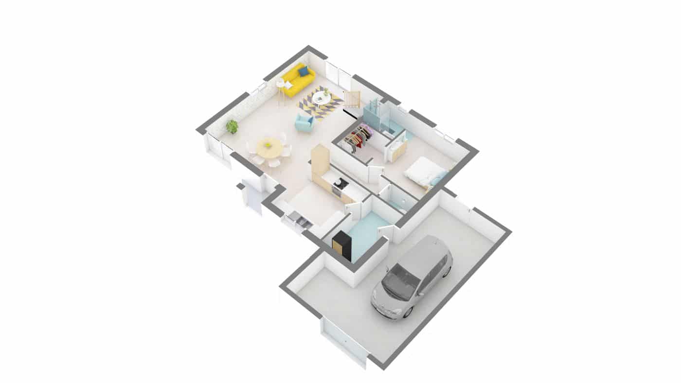 Son plan est ultra personnalisable. Et son design unique aux formes cubiques, avec porche d’entrée, en fait un modèle coup de cœur.