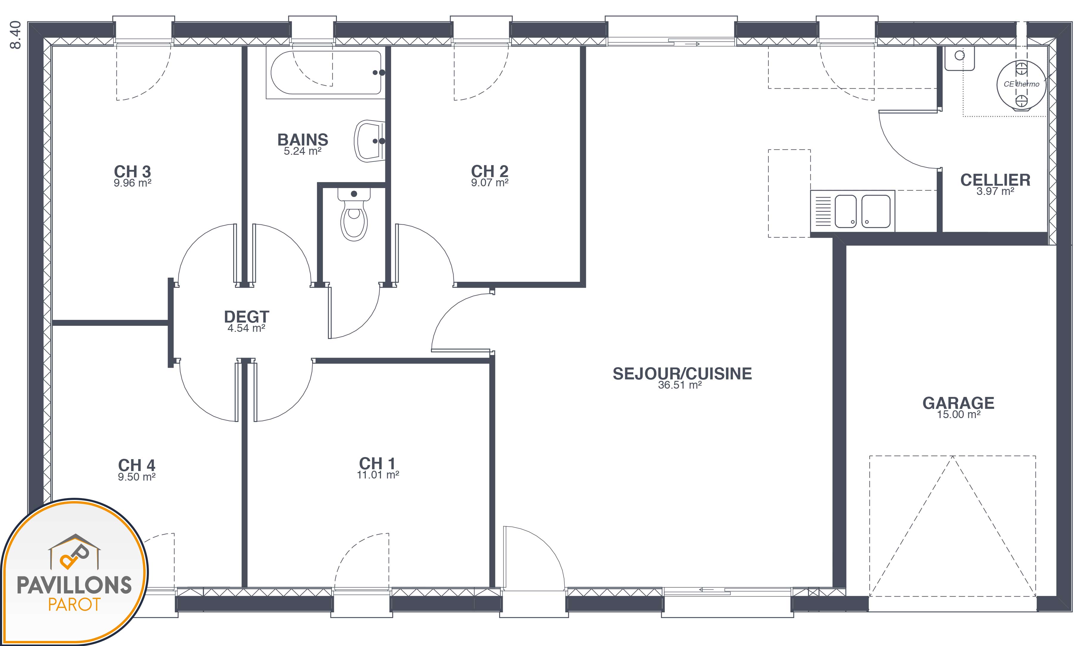 La plus spacieuse de notre entrée de gamme Primae offre 91 m² de surface habitable. Ce modèle Primae 4 vous prouve que l’espace n’est pas un luxe, car son prix est vraiment plancher. Mais chez Pavillons Parot, le low cost rime avec qualité.