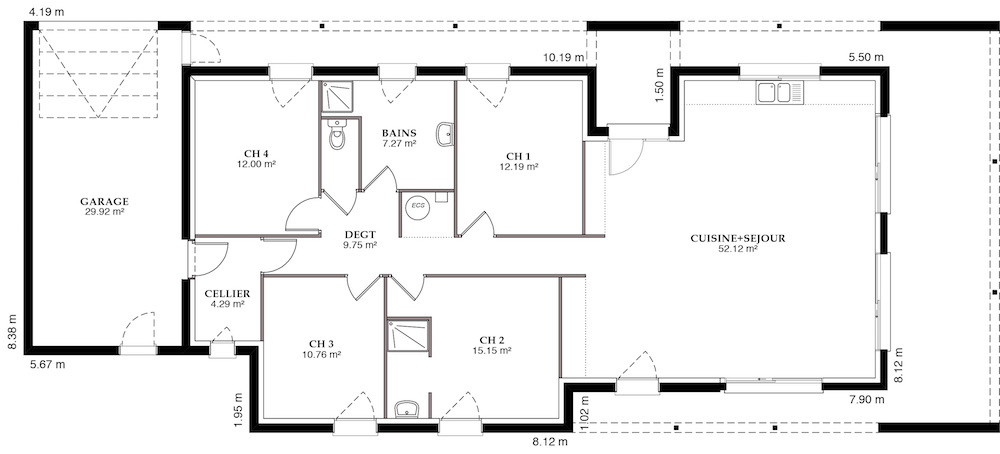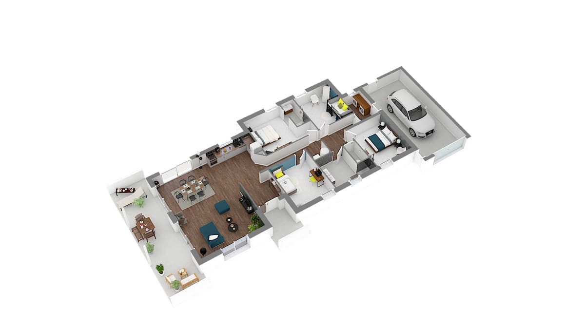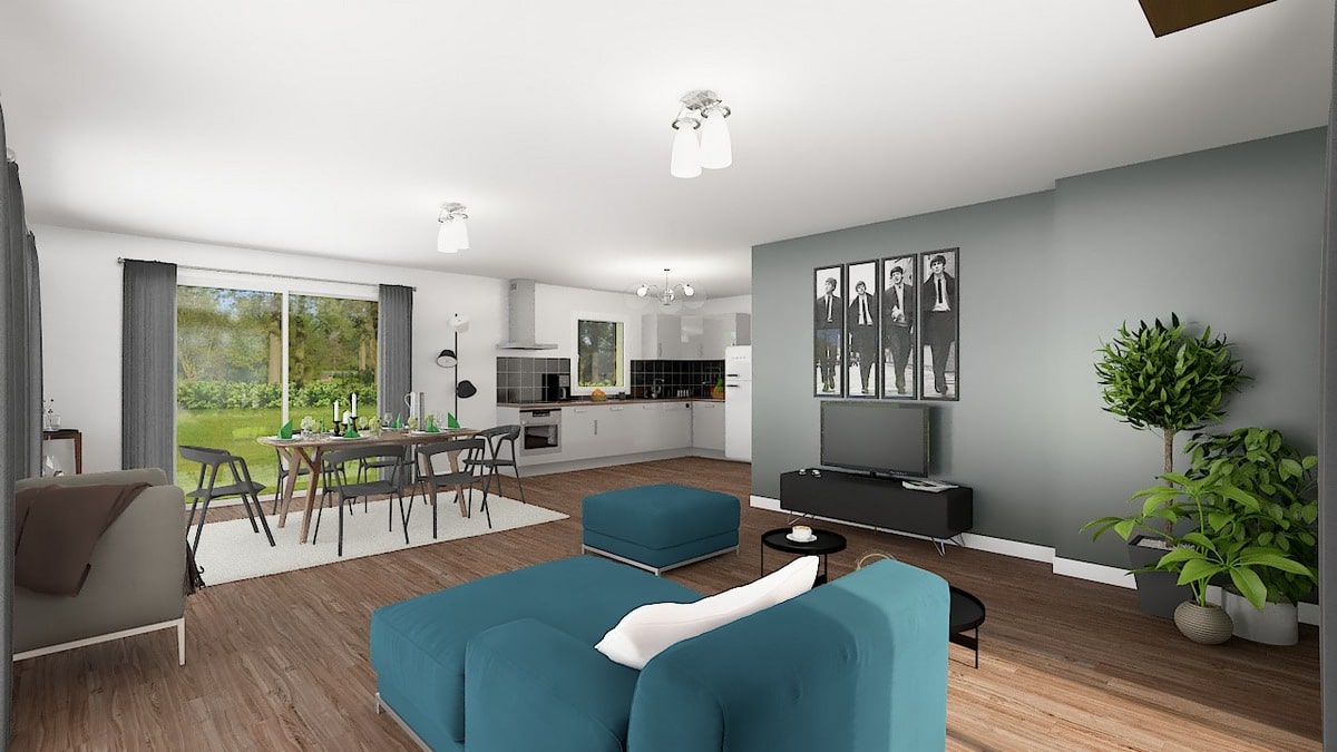 À l’intérieur, elle est tout aussi épatante. Deux versions sont proposées, offrant chacune une vaste pièce à vivre avec cuisine ouverte, un garage intégré communicant et un généreux cellier. Le modèle de 85 m² propose 3 chambres, celui de 125 m² en offre 4. Celles-ci donnent sur un dégagement.