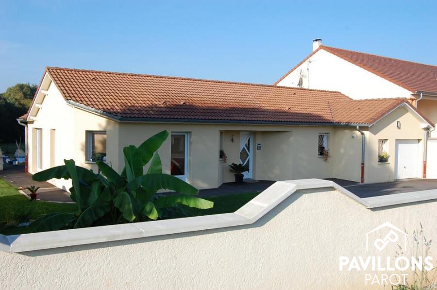 Un modèle en V dont beaucoup d’entre nous rêvons. Vastes volumes, partie jour séparée de la partie nuit, garage intégré. Remarquez la qualité de la construction sur vide sanitaire permettant de s’adapter à un terrain en légère pente.